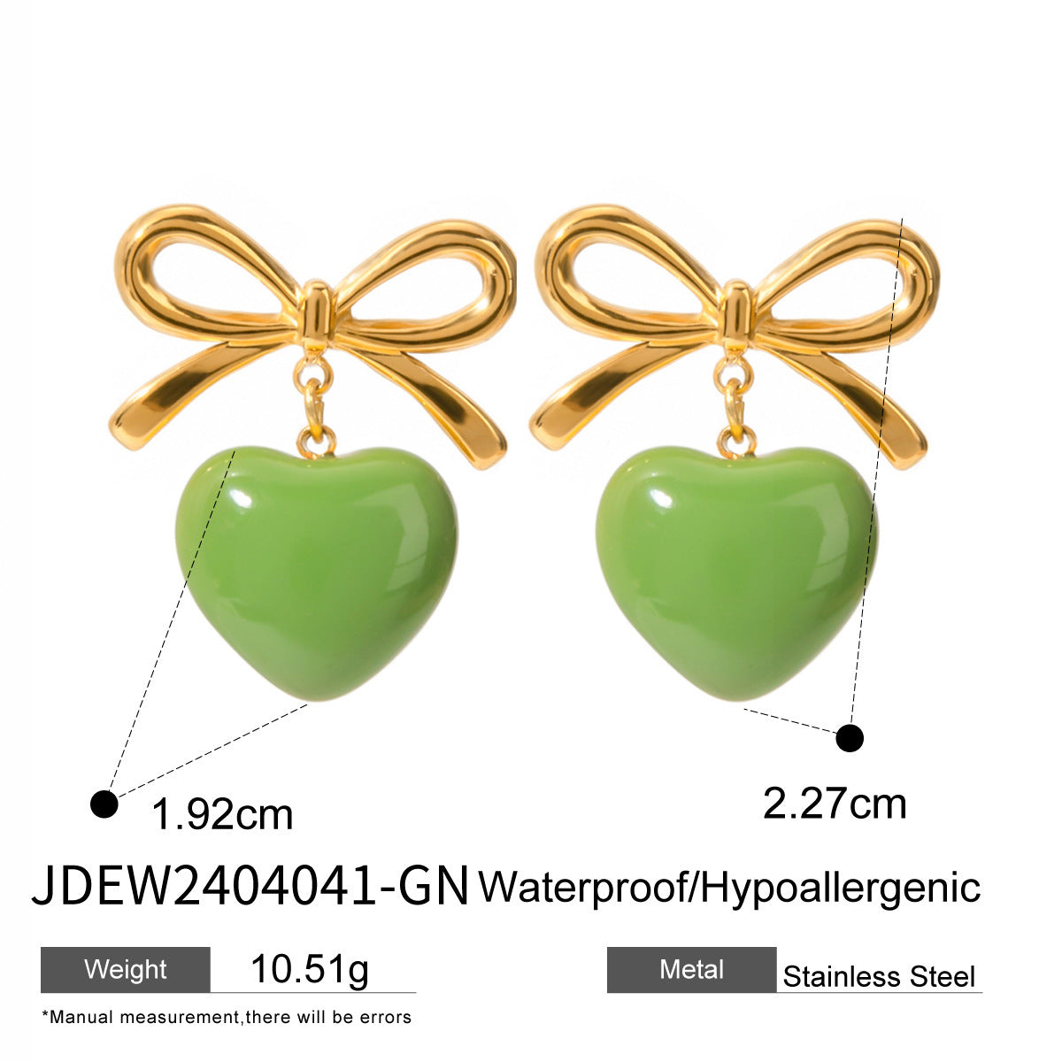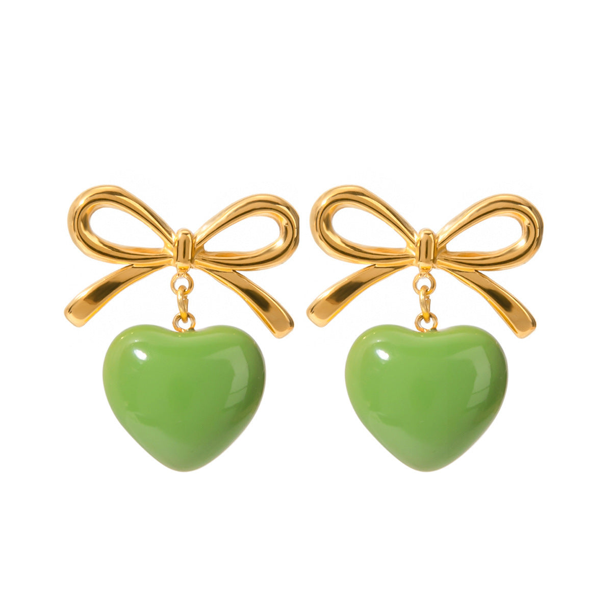 18K Gold Stainless Steel Bow Green Heart Earrings